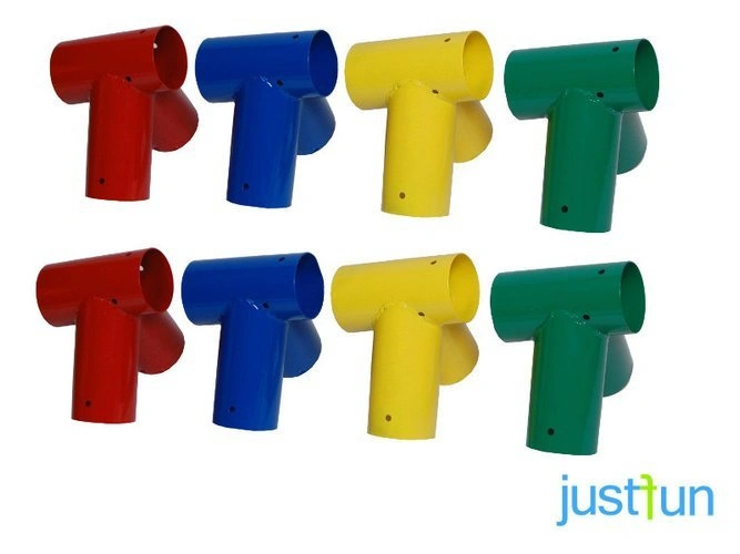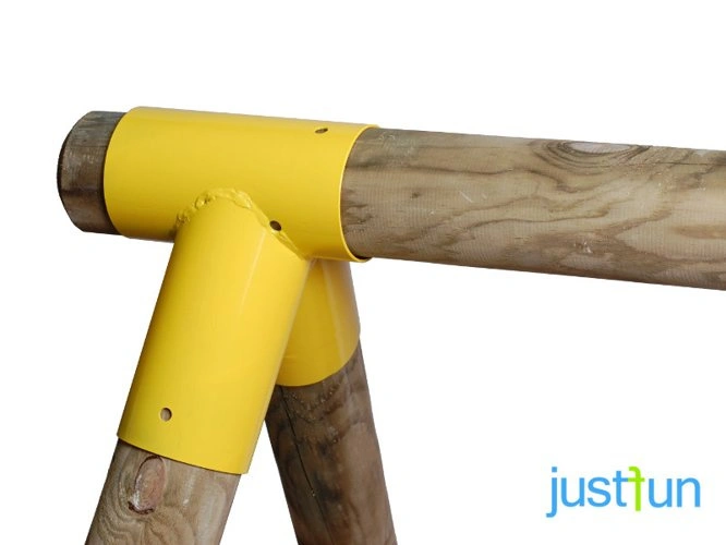 - Conector para viga redonda de 100 mm de diámetro para la construcción de columpios. Proporciona una estructura estable y duradera.