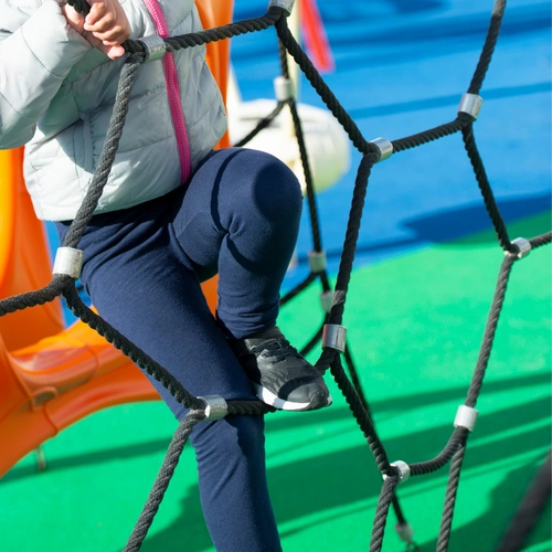 Se crean redes de escalada, linaria o elementos individuales a partir de cuerdas reforzadas? Para ello, utilice el anillo de apriete ovalado de aluminio de 24 mm absolutamente fiable para cable reforzado de Ø16 mm.