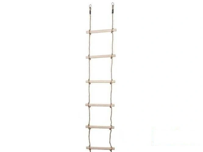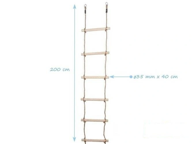 • Escalera de cuerda de seis peldaños. Un dispositivo que combina la diversión con el desarrollo físico del usuario. Las escaleras de escalada son adecuadas tanto para uso en exteriores como en interiores.