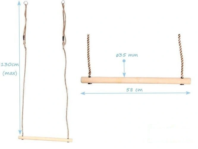 Un original y encantador trapecio de madera que proporcionará una excelente diversión a cualquier niño. Su funcionalidad permite el balanceo tradicional, así como la elevación, el colgado y otros ejercicios para mejorar la forma física. La cuidada fabricación y el uso de materiales de alta calidad garantizan aún más la seguridad de sus hijos. El trapecio de madera se utiliza ampliamente en diversos tipos de construcción.
