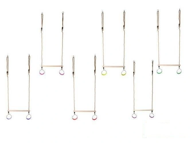 • Trapecio de madera con aros redondos sobre cuerdas. Una forma estupenda de divertirse de forma segura combinada con actividad física.